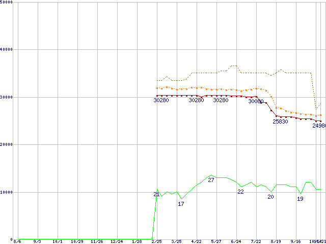 ※このグラフは過去のデータも税率5%相当に調整した税込み相当額のグラフです。 税率変更や、総額表示方式導入(2004年4月)の影響は除いています。 | | | ●凡例 | 最安値 (点線部は販売店未確認 または未調査) | 平均値 | 最高値 | ショップ数 |
