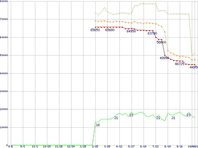 ※このグラフは過去のデータも税率5%相当に調整した税込み相当額のグラフです。 税率変更や、総額表示方式導入(2004年4月)の影響は除いています。 | | | ●凡例 | 最安値 (点線部は販売店未確認 または未調査) | 平均値 | 最高値 | ショップ数 |