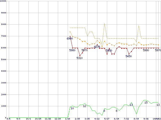 ※このグラフは過去のデータも税率5%相当に調整した税込み相当額のグラフです。 税率変更や、総額表示方式導入(2004年4月)の影響は除いています。 | | | ●凡例 | 最安値 (点線部は販売店未確認 または未調査) | 平均値 | 最高値 | ショップ数 |