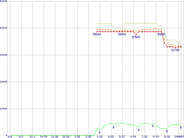 ※このグラフは過去のデータも税率5%相当に調整した税込み相当額のグラフです。 税率変更や、総額表示方式導入(2004年4月)の影響は除いています。 | | | ●凡例 | 最安値 (点線部は販売店未確認 または未調査) | 平均値 | 最高値 | ショップ数 |