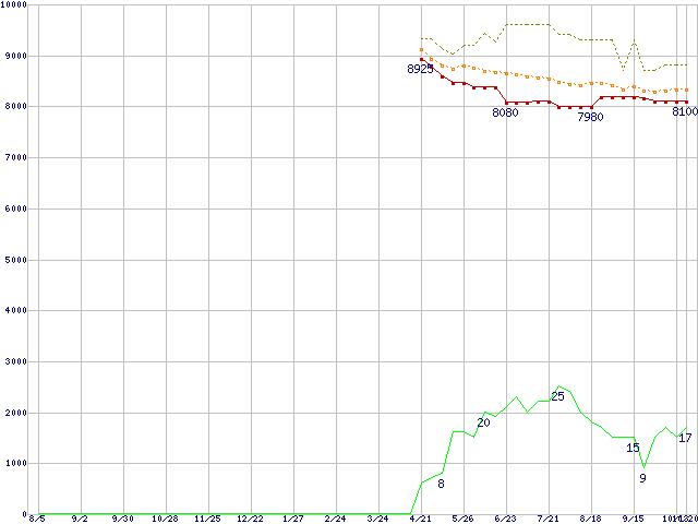 ※このグラフは過去のデータも税率5%相当に調整した税込み相当額のグラフです。 税率変更や、総額表示方式導入(2004年4月)の影響は除いています。 | | | ●凡例 | 最安値 (点線部は販売店未確認 または未調査) | 平均値 | 最高値 | ショップ数 |