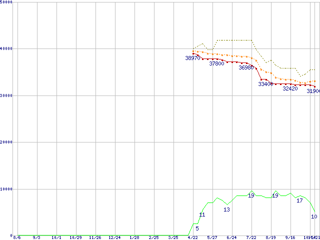 | Athlon 64 3700+ (2.2GHz,L2 1MB)の価格推移 | | | (2004年8月6日~2005年10月21日) |