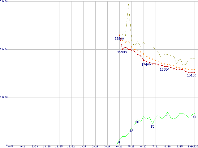 ※このグラフは過去のデータも税率5%相当に調整した税込み相当額のグラフです。 税率変更や、総額表示方式導入(2004年4月)の影響は除いています。 | | | ●凡例 | 最安値 (点線部は販売店未確認 または未調査) | 平均値 | 最高値 | ショップ数 |