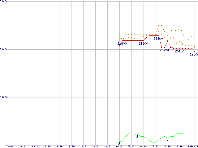 ※このグラフは過去のデータも税率5%相当に調整した税込み相当額のグラフです。 税率変更や、総額表示方式導入(2004年4月)の影響は除いています。 | | | ●凡例 | 最安値 (点線部は販売店未確認 または未調査) | 平均値 | 最高値 | ショップ数 |