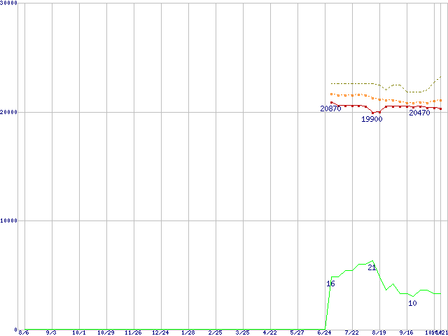※このグラフは過去のデータも税率5%相当に調整した税込み相当額のグラフです。 税率変更や、総額表示方式導入(2004年4月)の影響は除いています。 | | | ●凡例 | 最安値 (点線部は販売店未確認 または未調査) | 平均値 | 最高値 | ショップ数 |