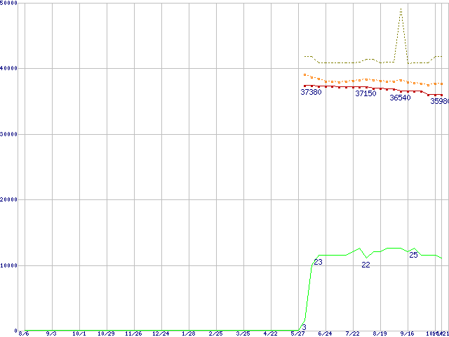 ※このグラフは過去のデータも税率5%相当に調整した税込み相当額のグラフです。 税率変更や、総額表示方式導入(2004年4月)の影響は除いています。 | | | ●凡例 | 最安値 (点線部は販売店未確認 または未調査) | 平均値 | 最高値 | ショップ数 |