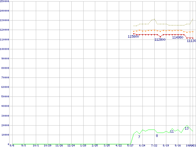 ※このグラフは過去のデータも税率5%相当に調整した税込み相当額のグラフです。 税率変更や、総額表示方式導入(2004年4月)の影響は除いています。 | | | ●凡例 | 最安値 (点線部は販売店未確認 または未調査) | 平均値 | 最高値 | ショップ数 |