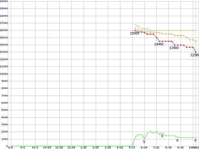 | Sempron 3300+ (2GHz,L2 128KB)の価格推移 | | | (2004年8月6日~2005年10月21日) |