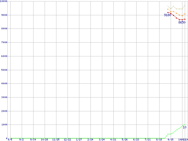 ※このグラフは過去のデータも税率5%相当に調整した税込み相当額のグラフです。 税率変更や、総額表示方式導入(2004年4月)の影響は除いています。 | | | ●凡例 | 最安値 (点線部は販売店未確認 または未調査) | 平均値 | 最高値 | ショップ数 |