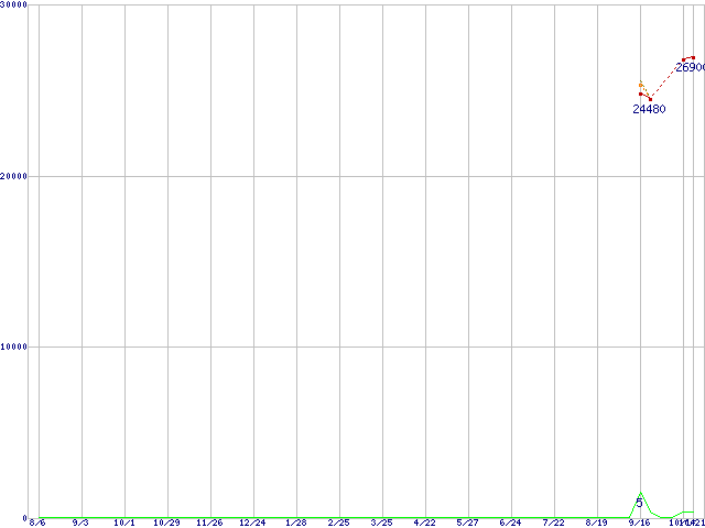 ※このグラフは過去のデータも税率5%相当に調整した税込み相当額のグラフです。 税率変更や、総額表示方式導入(2004年4月)の影響は除いています。 | | | ●凡例 | 最安値 (点線部は販売店未確認 または未調査) | 平均値 | 最高値 | ショップ数 |