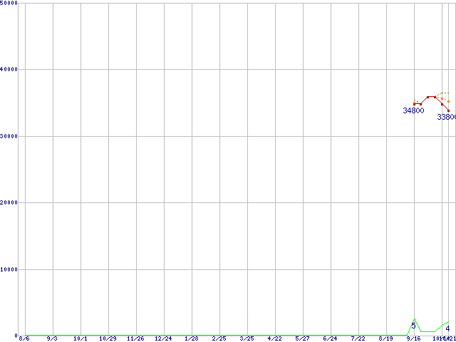 ※このグラフは過去のデータも税率5%相当に調整した税込み相当額のグラフです。 税率変更や、総額表示方式導入(2004年4月)の影響は除いています。 | | | ●凡例 | 最安値 (点線部は販売店未確認 または未調査) | 平均値 | 最高値 | ショップ数 |