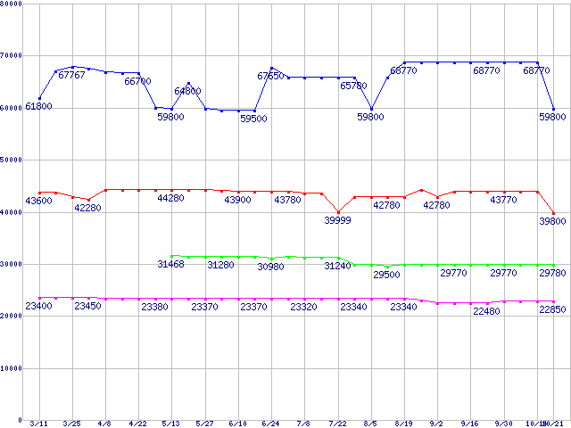 | LGA 775 (FSB 800MHz,L2 1MB,Hyper-Threading,NX bit対応)の最安値推移 | | | (2005年3月11日~2005年10月21日) |