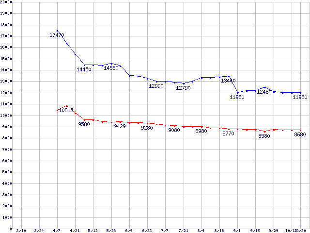 | Deskstar T7K250 (7200rpm,Serial ATA II/3Gbps)の最安値推移 | | | (2005年3月10日~2005年10月20日) |