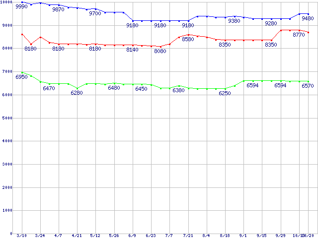 | Barracuda 7200.7 SATA (7200rpm,Serial ATA,NCQ,8MB,80GB/Platter)の最安値推移 | | | (2005年3月10日~2005年10月20日) |