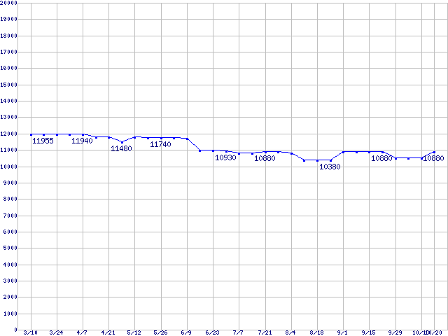 | Barracuda 7200.7 SATA (7200rpm,Serial ATA/150,8MB,100GB/Platter)の最安値推移 | | | (2005年3月10日~2005年10月20日) |