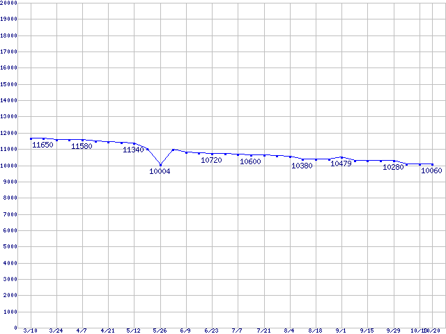| Barracuda 7200.7 Plus (7200rpm,Ultra ATA/100,8MB,100GB/Platter)の最安値推移 | | | (2005年3月10日~2005年10月20日) |