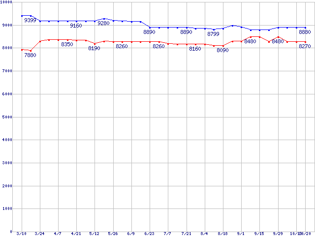 | Barracuda 7200.7 Plus (7200rpm,Ultra ATA/100,8MB,80GB/Platter)の最安値推移 | | | (2005年3月10日~2005年10月20日) |