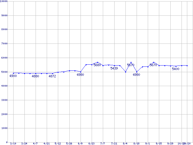 | Barracuda 5400.1 (5400rpm,Ultra ATA/100,2MB)の最安値推移 | | | (2005年3月10日~2005年10月20日) |