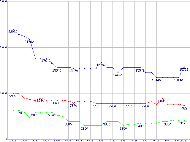 | PC2700(DDR333) DDR SDRAM DIMM ECC対応 Registeredタイプの最安値推移 | | | (2005年3月12日~2005年10月22日) |