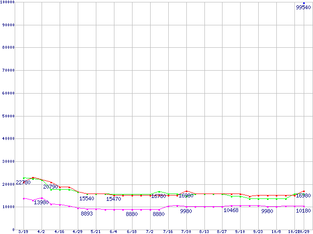 メモリ主要製品(最安値1万円以上)の最安値推移