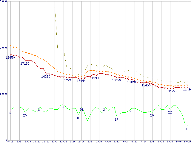 ※このグラフは過去のデータも税率5%相当に調整した税込み相当額のグラフです。 税率変更や、総額表示方式導入(2004年4月)の影響は除いています。 | | | ●凡例 | 最安値 (点線部は販売店未確認 または未調査) | 平均値 | 最高値 | ショップ数 |