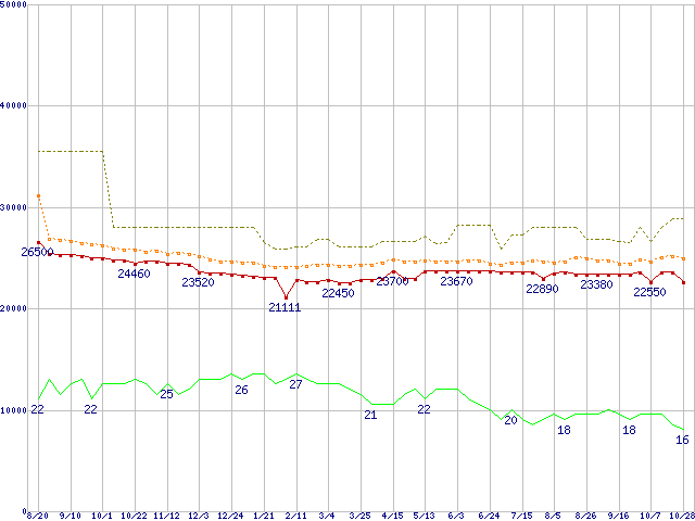 ※このグラフは過去のデータも税率5%相当に調整した税込み相当額のグラフです。 税率変更や、総額表示方式導入(2004年4月)の影響は除いています。 | | | ●凡例 | 最安値 (点線部は販売店未確認 または未調査) | 平均値 | 最高値 | ショップ数 |