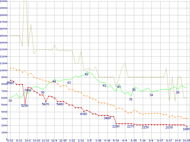 ※このグラフは過去のデータも税率5%相当に調整した税込み相当額のグラフです。 税率変更や、総額表示方式導入(2004年4月)の影響は除いています。 | | | ●凡例 | 最安値 (点線部は販売店未確認 または未調査) | 平均値 | 最高値 | ショップ数 |