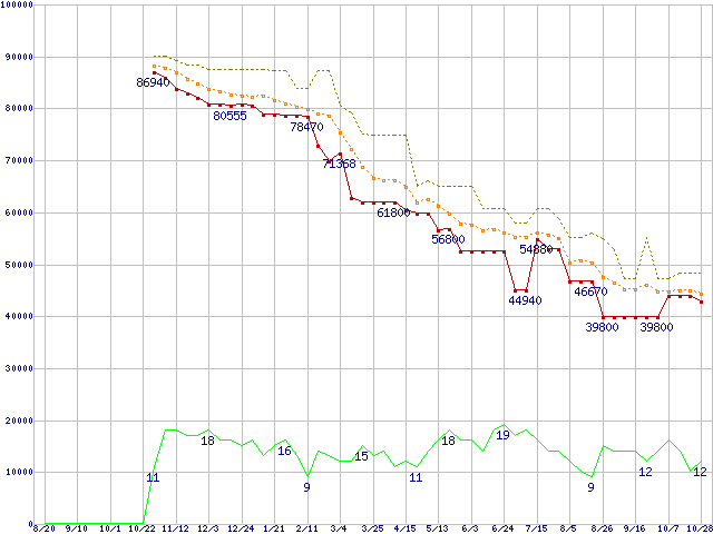 | Athlon 64 4000+ (2.4GHz,L2 1MB)の価格推移 | | | (2004年8月20日~2005年10月28日) |