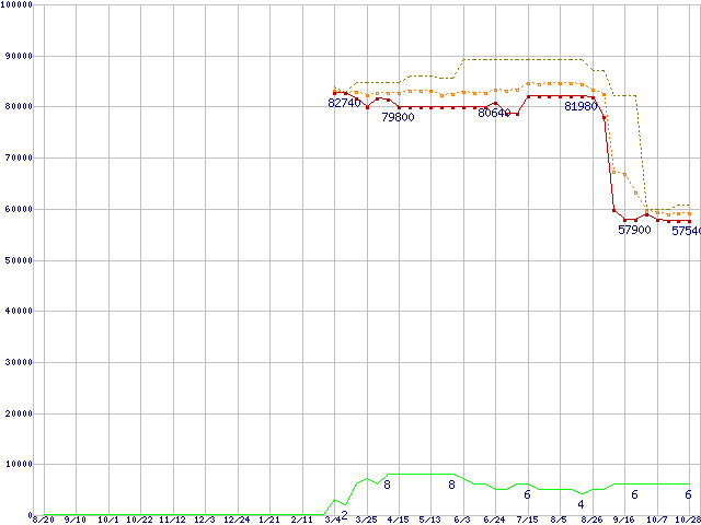 ※このグラフは過去のデータも税率5%相当に調整した税込み相当額のグラフです。 税率変更や、総額表示方式導入(2004年4月)の影響は除いています。 | | | ●凡例 | 最安値 (点線部は販売店未確認 または未調査) | 平均値 | 最高値 | ショップ数 |