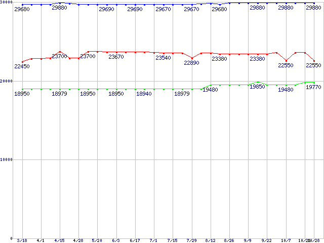 | Socket 478 (FSB 800MHz,L2 1MB,Hyper-Threading)の最安値推移 | | | (2005年3月18日~2005年10月28日) |