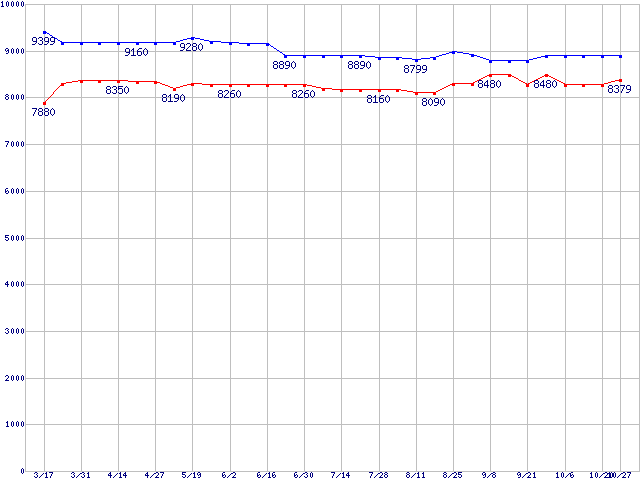 | Barracuda 7200.7 Plus (7200rpm,Ultra ATA/100,8MB,80GB/Platter)の最安値推移 | | | (2005年3月17日~2005年10月27日) |