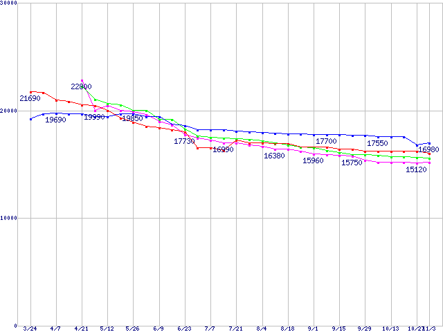 HDD主要製品(最安値1万5千円~2万円未満)の最安値推移
