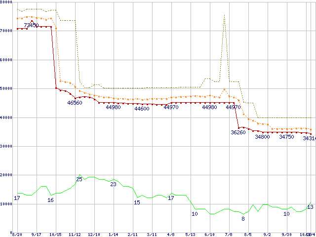 ※このグラフは過去のデータも税率5%相当に調整した税込み相当額のグラフです。 税率変更や、総額表示方式導入(2004年4月)の影響は除いています。 | | | ●凡例 | 最安値 (点線部は販売店未確認 または未調査) | 平均値 | 最高値 | ショップ数 |