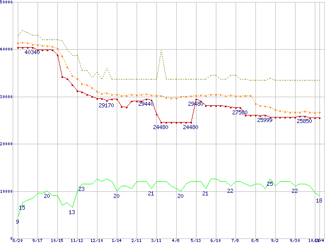 ※このグラフは過去のデータも税率5%相当に調整した税込み相当額のグラフです。 税率変更や、総額表示方式導入(2004年4月)の影響は除いています。 | | | ●凡例 | 最安値 (点線部は販売店未確認 または未調査) | 平均値 | 最高値 | ショップ数 |