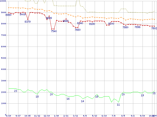 ※このグラフは過去のデータも税率5%相当に調整した税込み相当額のグラフです。 税率変更や、総額表示方式導入(2004年4月)の影響は除いています。 | | | ●凡例 | 最安値 (点線部は販売店未確認 または未調査) | 平均値 | 最高値 | ショップ数 |