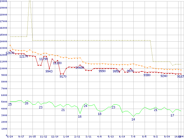 ※このグラフは過去のデータも税率5%相当に調整した税込み相当額のグラフです。 税率変更や、総額表示方式導入(2004年4月)の影響は除いています。 | | | ●凡例 | 最安値 (点線部は販売店未確認 または未調査) | 平均値 | 最高値 | ショップ数 |