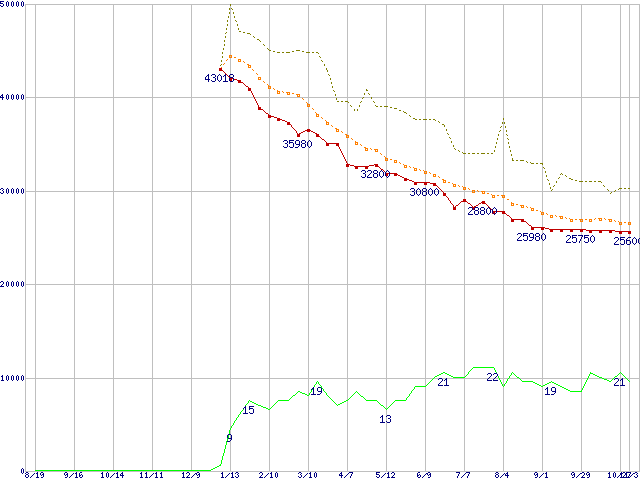 ※このグラフは過去のデータも税率5%相当に調整した税込み相当額のグラフです。 税率変更や、総額表示方式導入(2004年4月)の影響は除いています。 | | | ●凡例 | 最安値 (点線部は販売店未確認 または未調査) | 平均値 | 最高値 | ショップ数 |
