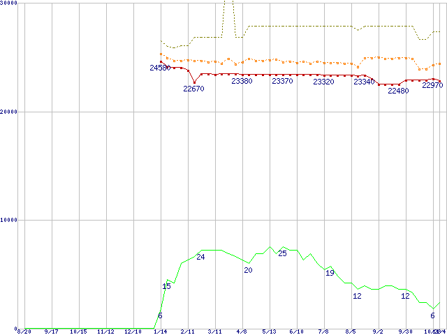※このグラフは過去のデータも税率5%相当に調整した税込み相当額のグラフです。 税率変更や、総額表示方式導入(2004年4月)の影響は除いています。 | | | ●凡例 | 最安値 (点線部は販売店未確認 または未調査) | 平均値 | 最高値 | ショップ数 |