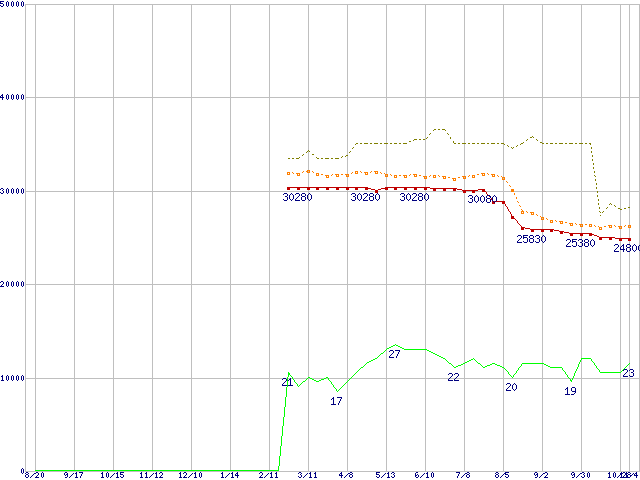 ※このグラフは過去のデータも税率5%相当に調整した税込み相当額のグラフです。 税率変更や、総額表示方式導入(2004年4月)の影響は除いています。 | | | ●凡例 | 最安値 (点線部は販売店未確認 または未調査) | 平均値 | 最高値 | ショップ数 |