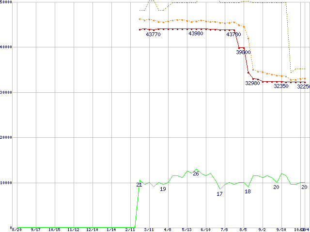 ※このグラフは過去のデータも税率5%相当に調整した税込み相当額のグラフです。 税率変更や、総額表示方式導入(2004年4月)の影響は除いています。 | | | ●凡例 | 最安値 (点線部は販売店未確認 または未調査) | 平均値 | 最高値 | ショップ数 |