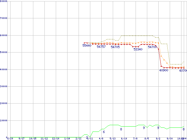 ※このグラフは過去のデータも税率5%相当に調整した税込み相当額のグラフです。 税率変更や、総額表示方式導入(2004年4月)の影響は除いています。 | | | ●凡例 | 最安値 (点線部は販売店未確認 または未調査) | 平均値 | 最高値 | ショップ数 |