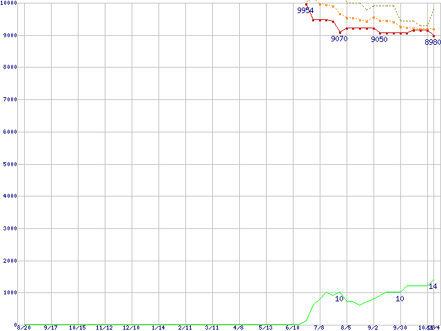 ※このグラフは過去のデータも税率5%相当に調整した税込み相当額のグラフです。 税率変更や、総額表示方式導入(2004年4月)の影響は除いています。 | | | ●凡例 | 最安値 (点線部は販売店未確認 または未調査) | 平均値 | 最高値 | ショップ数 |