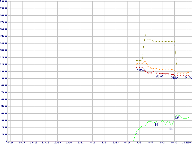 ※このグラフは過去のデータも税率5%相当に調整した税込み相当額のグラフです。 税率変更や、総額表示方式導入(2004年4月)の影響は除いています。 | | | ●凡例 | 最安値 (点線部は販売店未確認 または未調査) | 平均値 | 最高値 | ショップ数 |