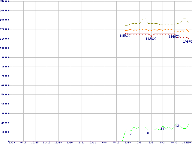 ※このグラフは過去のデータも税率5%相当に調整した税込み相当額のグラフです。 税率変更や、総額表示方式導入(2004年4月)の影響は除いています。 | | | ●凡例 | 最安値 (点線部は販売店未確認 または未調査) | 平均値 | 最高値 | ショップ数 |