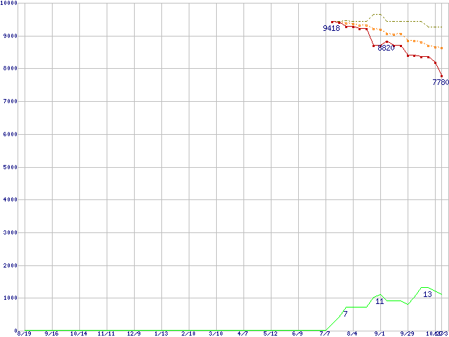 ※このグラフは過去のデータも税率5%相当に調整した税込み相当額のグラフです。 税率変更や、総額表示方式導入(2004年4月)の影響は除いています。 | | | ●凡例 | 最安値 (点線部は販売店未確認 または未調査) | 平均値 | 最高値 | ショップ数 |