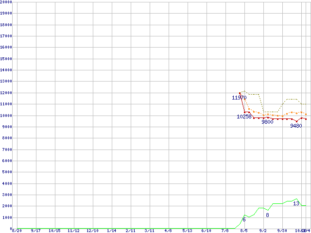 ※このグラフは過去のデータも税率5%相当に調整した税込み相当額のグラフです。 税率変更や、総額表示方式導入(2004年4月)の影響は除いています。 | | | ●凡例 | 最安値 (点線部は販売店未確認 または未調査) | 平均値 | 最高値 | ショップ数 |
