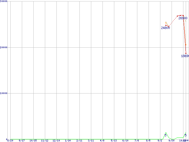 ※このグラフは過去のデータも税率5%相当に調整した税込み相当額のグラフです。 税率変更や、総額表示方式導入(2004年4月)の影響は除いています。 | | | ●凡例 | 最安値 (点線部は販売店未確認 または未調査) | 平均値 | 最高値 | ショップ数 |