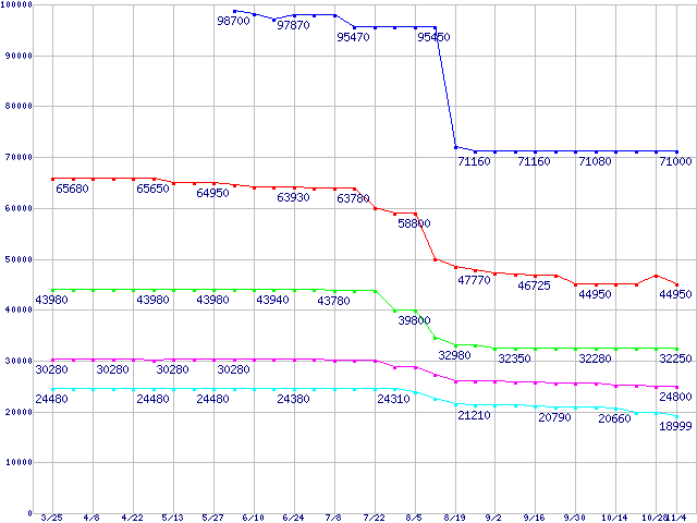 | LGA 775 (FSB 800MHz,L2 2MB,Hyper-Threading,EM64T・NX bit対応)の最安値推移 | | | (2005年3月25日~2005年11月4日) |