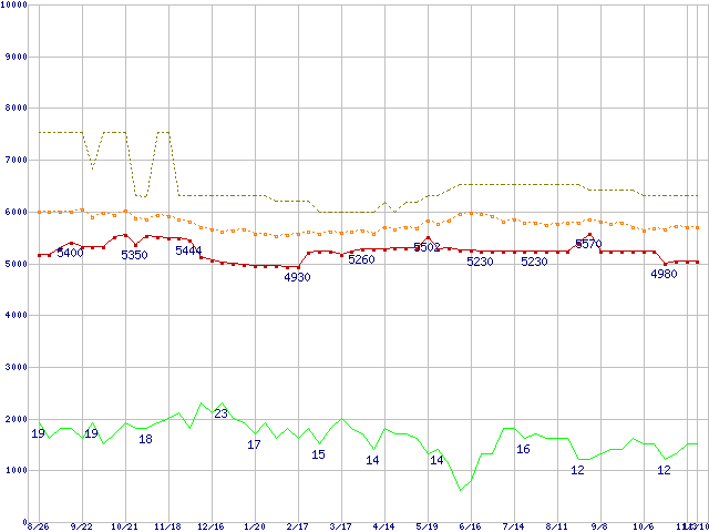※このグラフは過去のデータも税率5%相当に調整した税込み相当額のグラフです。 税率変更や、総額表示方式導入(2004年4月)の影響は除いています。 | | | ●凡例 | 最安値 (点線部は販売店未確認 または未調査) | 平均値 | 最高値 | ショップ数 |