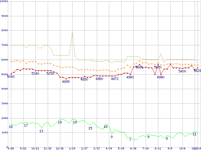 ※このグラフは過去のデータも税率5%相当に調整した税込み相当額のグラフです。 税率変更や、総額表示方式導入(2004年4月)の影響は除いています。 | | | ●凡例 | 最安値 (点線部は販売店未確認 または未調査) | 平均値 | 最高値 | ショップ数 |
